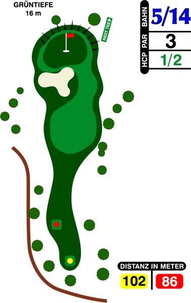 Ein kurzes bergab zu spielendes Par 3 nach einem etwas längeren Verbindungsweg nach Bahn 13. Die linke Seite des Grüns wird von einer großen Bunkerlandschaft mit zwei vorgelagerten Bunkern geschützt. Da das Grün rechts offen ist, sei dem Durchschnittsgolfer empfohlen seinen Ball möglichst rechts zu halten, um den tückischen Bunkern zur Linken zu entkommen. Der rechte Grünbunker wird in erster Linie zu lange geschlagene und verzogene Bälle auffangen.