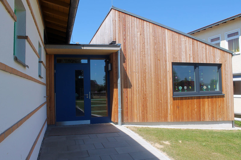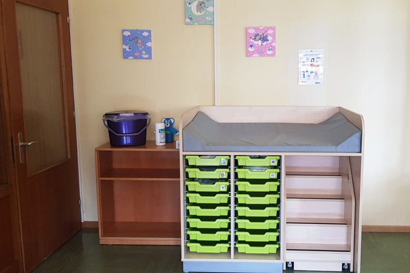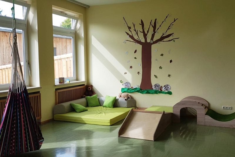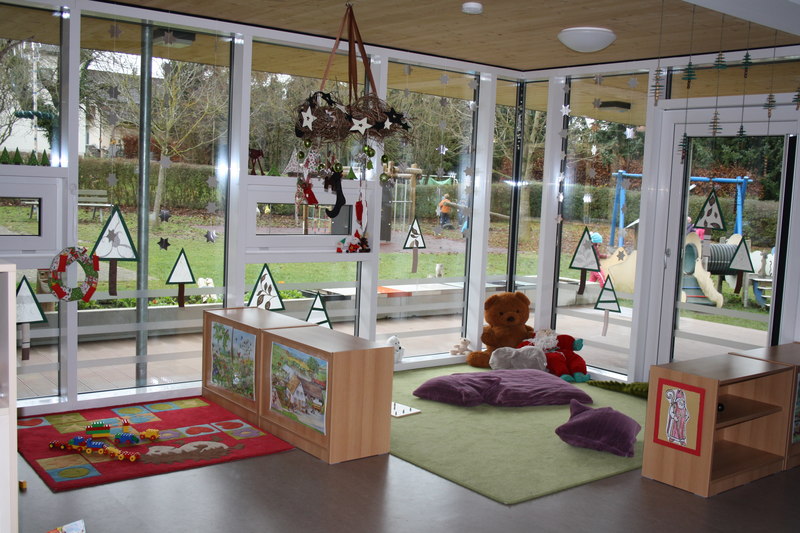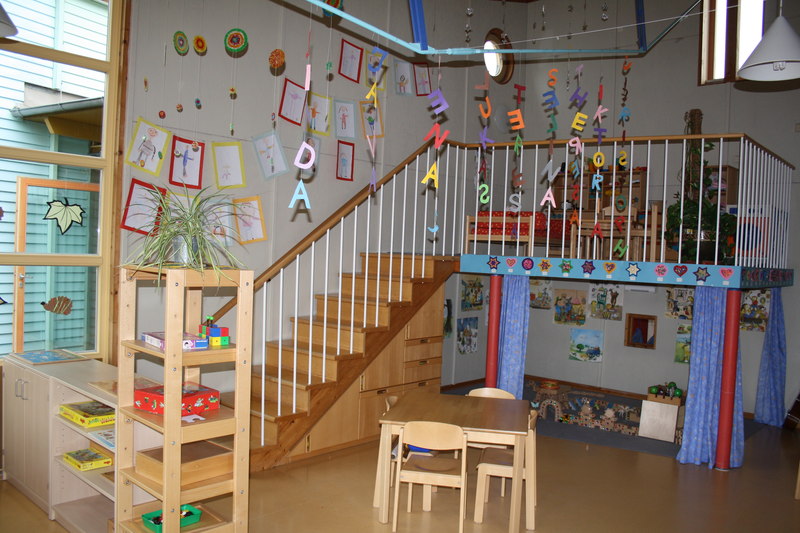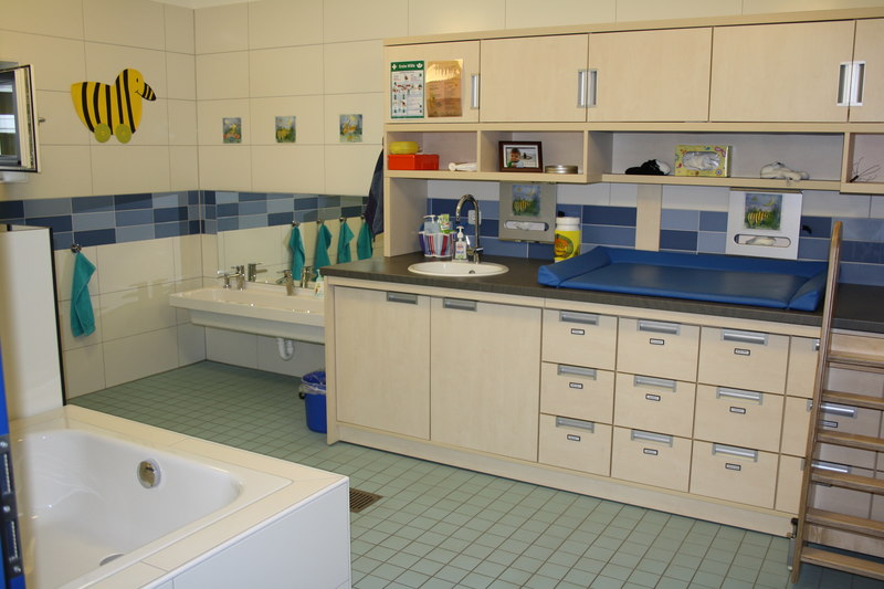 Die Krippe wurde 2014 neue angebaut und hat einen eigenen Gruppenraum mit Terrasse. An den Gruppenraum angeschlossen sind der angrenzende Schlafraum und das Kinder-Bad mit Krippentoiletten, großem Wickelbereich und einer Badewanne.
