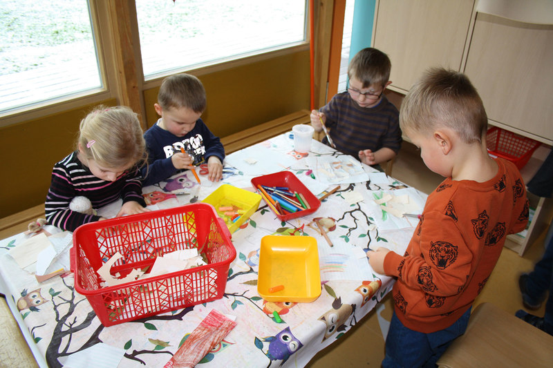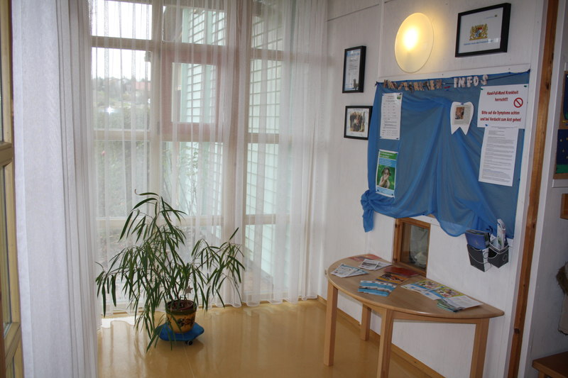 Zur Kinderkrippe gehören auch eine Garderobe für die Kleinsten und ein Kinderwagen-Parkplatz. Zudem gibt es auch hier einen Intensivraum, welchen alle Gruppe regelmäßig für verschiedene Angebote nutzen. Die große Gruppe vorwiegend zur Vorschule.