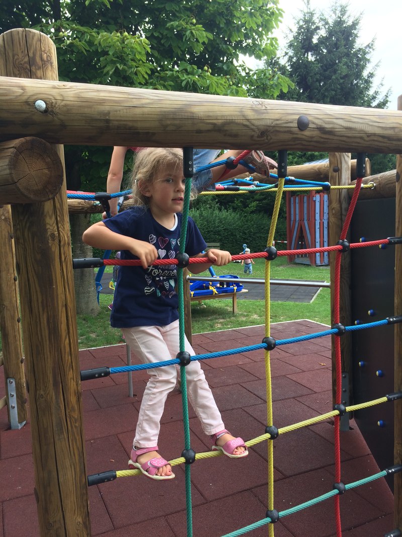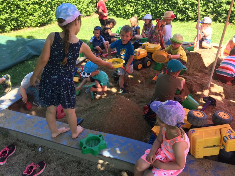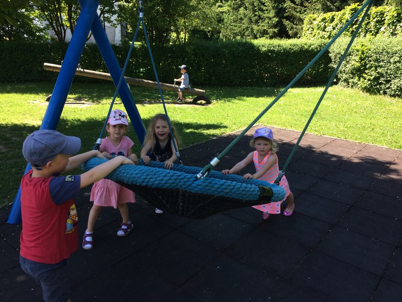 Der schön angelegte Garten lädt die Kinder zum Spielen und Toben ein. Sie können tolle Burgen im großen Sandkasten mit Sonnensegel bauen, mit verschiedenen Fahrzeugen fahren, in dem großen Vogelnest schaukeln oder klettern am großen Gerüst. Für die Krippen- und Kindergartenkinder gibt es jeweils einen Kletterturm und im Sommer kann man neben der Wasserbahn auch die Wasserrutsche nutzen. Hüpfpferde, Hüpfbälle, Gartenstühle, Bälle etc. sind im Schuppen ebenso zu finden wie alle möglichen Sandspielsachen oder Fahrzeuge. Im Winter kann man den kleinen Hügel zum Schlittenfahren nutzen!