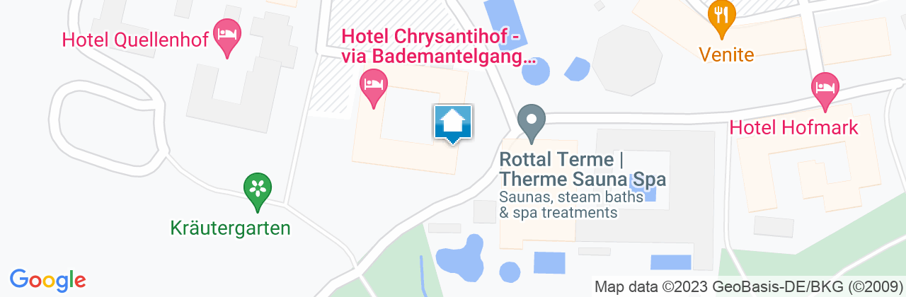 By the spring: get from Hotel Chrysantihof directly into the Rottal Terme via a bathrobe walk. Here, in the middle of idyllic Bad Birnbach, the **** Wellnesshotel Chrysantihof is located in a park that exudes peacefulness. It impresses with a wide range of offers for the health-oriented, sporty, or active guest. A varied sports programme, a wide range of beauty treatments, a broad assortment of medical and wellness treatments, as well as a large variety of international cuisine and Bavarian delicacies, conjured up from local products, belong to the repertoire of the Chrysantihof. Thanks to our roadworthy golf cart, you can reach the Bella Vista golf park directly and can tee off immediately.Conditions/extras
