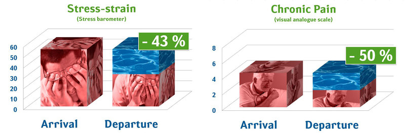 Compared to a control group at home, both groups, which took part in the prevention programme in Bad Birnbach, significantly reduced their subjective perception of stress (measured using questionnaire PSQ1, on a scale of 0 to 100). Participants of group B (programme without psycho-educative seminar) improved on average up to 16 points, test persons of study group A - who additionally completed psycho-educative sessions e.g. with logotherapy according to Viktor Frankl - achieved better values of up to 30 points. The four-day refresher course after six months made a decisive contribution to stabilising the positive effects of the prevention programme.