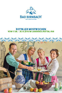 Rottaler Mostwochen 2016 Vom 17.09. – 30.10.2016 im Landkreis Rottal-Inn Die Rottaler Mostkönigin lädt ein, den Most vollkommen neu kennenzulernen – mit interessanten Fakten und leckeren Rezepten. |